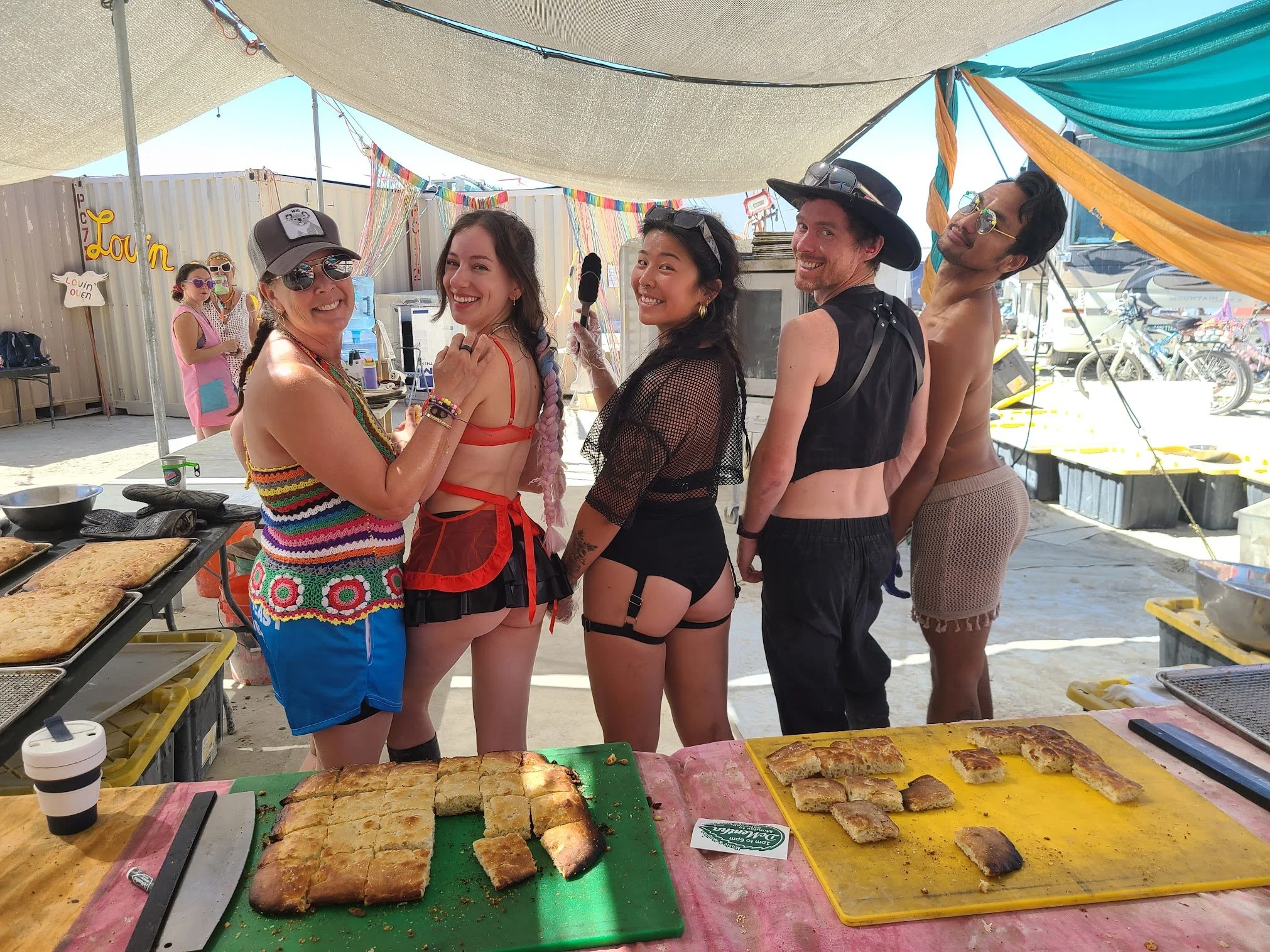 What we do. We bake sourdough focaccia every morning from Tuesday through Sunday from 10:00 to 14:00 (approx). For those new to our camp, this is when the family comes together: to bake, gift, dance, play music, hang out, catch up, etc. You don’t have to be there every morning of course, but most of us simply want to be there for some time during the morning, most of the days that we are baking.
