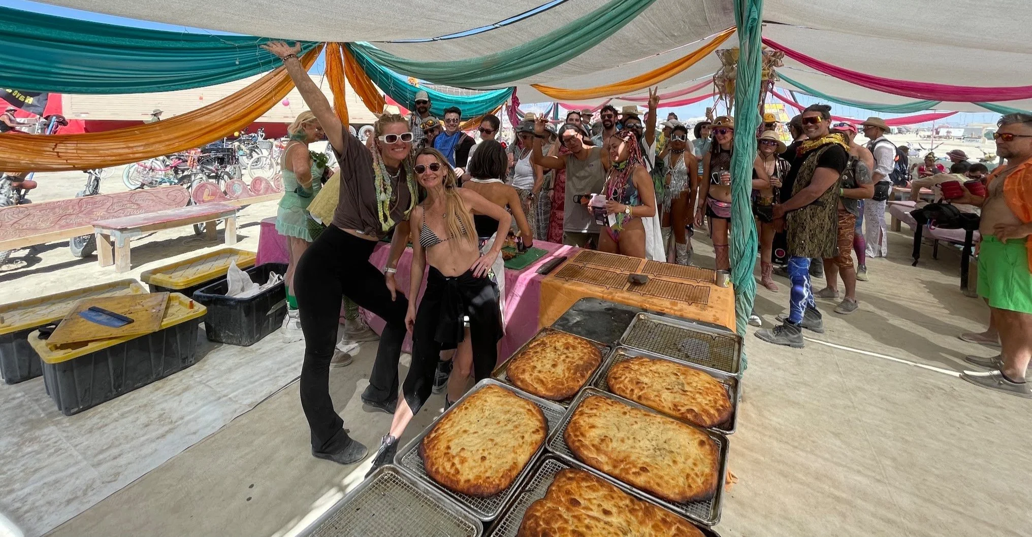 We believe Burning Man is about becoming as an individual one with a group, and even more significantly, that group of which you’ve become a part becoming a part of one greater group … groups that solve their problems with wisdom and assistance and kindness in search of fairness and unity and “can someone help me lift this?”’, rather than groups that solve their disputes with bullying or conniving or violence in search of an upper hand or exploitation or a free ride. What we give to the community beyond ours is bread and comfort. Some say the making of bread gives meaning. Bread is typically made from few ingredients, yet the result is complex. And like our campmates no two loaves are exactly the same. With each piece of bread handed to a stranger, we express our love and unity, and with each gift, we make a new friend.